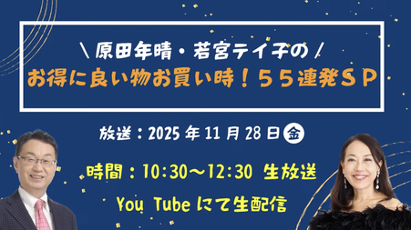 2025年11月28日(金)ラジオ大阪 ブラックフライデー2時間スペシャル「原田年晴・若宮テイ子のお得に良い物お買い時!55連発SP」と題してラジオと共にYOU TUBEにて生配信を実施。ラジオ局スタジオへ3台のカメラを導入しテンポ良く番組を配信した。出演はラジオ大阪アナウンサー原田年晴さん、ラジオパーソナリティー若宮テイ子さんにショッピングキャスターの泉ゆうこさんが2時間で55商品を紹介した。ソールドアウトした商品も複数。次回は更にブラッシュアップできればと考えています。